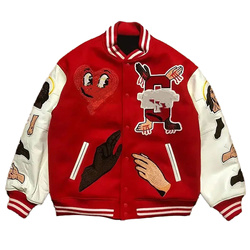 流行のグラフィティパッチワークウールデザインラインストーンカスタムビンテージバーシティ野球刺繍フロントジャケットカスタマイズ可能な色